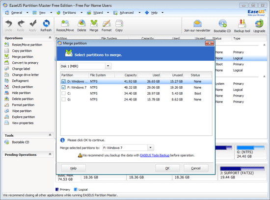 EASEUS Partition Master Professional is an all-in-one drive partition solution and disk management utility. It allows you to extend partition, especially for system drives, settle low disk space problems, manage disk space easily. Free version also available.