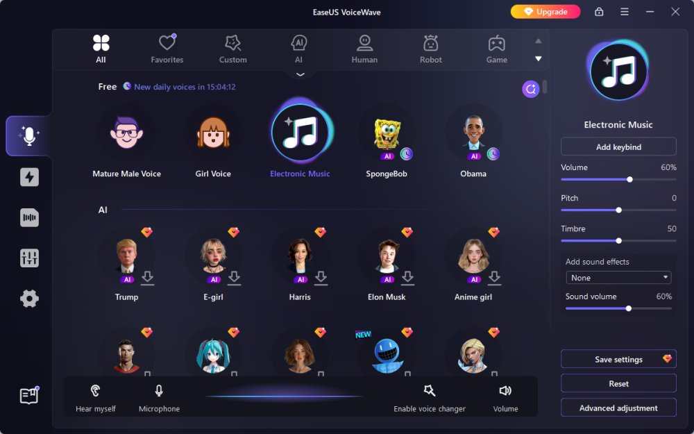 EaseUS VoiceWave is a real-time AI voice changer for Windows 10 and 11, designed to transform your voice across various platforms like Discord, Zoom, OBS, and more. VoiceWave offers over 200 voice effects, including celebrity impressions, anime characters, and custom creations.