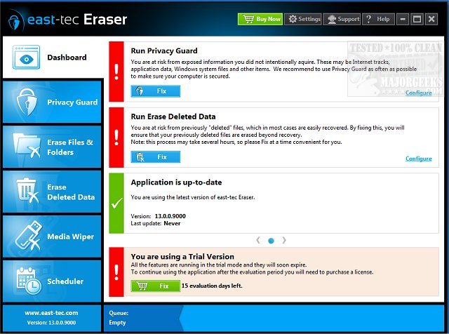 east-tec Eraser features an intuitive dashboard-style interface divided into clear sections: Privacy Guard, Erase Files & Folders, Erase Deleted Data, Media Wiper, and Scheduler. Each section provides specific functions for managing and erasing different types of data.