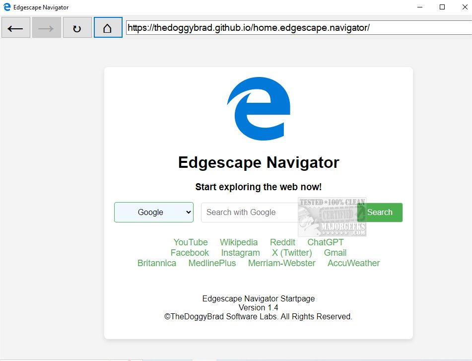 The interface is simple, featuring essential buttons such as forward, backward, reload, and homepage, along with a user-friendly address bar for easy navigation. Built on the robust EdgeWebView2 runtime, Edgescape Navigator ensures quick load times and seamless performance, making it an ideal choice for those who seek a no-frills, distraction-free browsing solution.