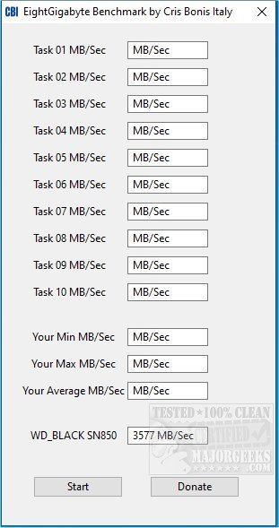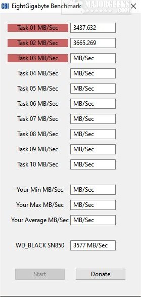 Weh you run EightGigabyte Benchmark, you are presented with a simple interface that displays tasks 1-10 and their subsequent MB/seconds to perform them. It also calculates your minimum, maximum, and overall average. Keep in mind; This version will run only with 8 GB (or more of free RAM; otherwise, you will see a popup alert.