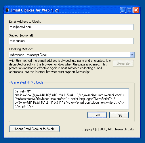 Email Cloaker for Web - Simple utility generates code that cloaks e-mail addresses in HTML and prevents them from being harvested by spam spiders.