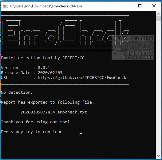 Emotet generates their process name from a specific word dictionary and C drive serial. EmoCheck will quickly scan the running process on the host, and find the Emotet process from their process name. EmoCheck provides a report detailing what was found and where. From there, you will need to remove the malware by using a malware removal app such as Malwarebytes.