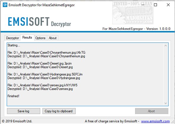 Emsisoft Decryptor for Maze/Sekhmet/Egregor will inform you that the decryption process is complete. If you require a report for your records, you can save it by clicking the Save Log button. You also have the option to copy it straight to your clipboard for use in emails, forum posts, etc., if needed.