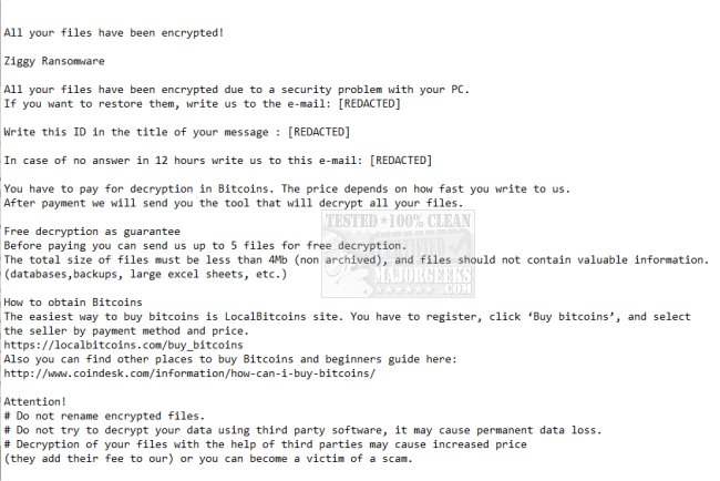 The Ziggy ransomware first appeared near the end of 2020. It works by encrypting files using RSA-4096 and AES-256 GCM, and adds the extension ".id=[].email=[].ziggy".