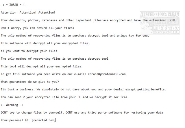 The ransom note titled --DECRYPT--ZORAB.txt will contain the following text: