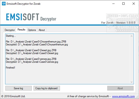 Emsisoft Decryptor for Zorab will inform you that the decryption process is complete. If you require a report for your records, you can save it by clicking the Save Log button. You also have the option to copy it straight to your clipboard for use in emails, forum posts, etc., if needed.