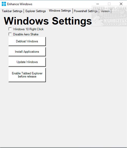 Enhance Windows helps remove or add specific features to Windows 10 and 11. Once run through elevated Power Shell, the features available within this script are broken down within the interface into points of interest outlined below for both windows 10 and 11. Inside each is the available fixes, like Windows Settings, which contains check boxes for Windows 10 Right Click and Disable/Enable Aero Shake. You also debloat Windows, install apps, update windows and enable tabbed Explorer.