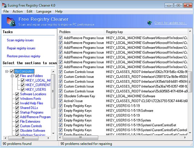 Eusing Free Registry Cleaner will clean up your Registry by finding: