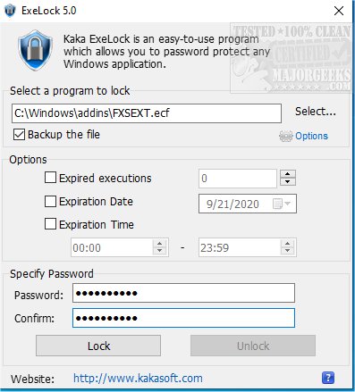 ExeLock will come in handy when you share your machine with others as it allows you to lock up programs preventing others from running them like a tax preparation app, employee reviews, etc. ExeLock is perfect for these situations. It permits you to password-protect executables safeguarding them so only those who have the password can run the protected program.