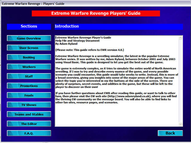 Extreme Warfare Revenge is a text based wrestling based simulation game designed to have a massive amount of depth for a text based game.