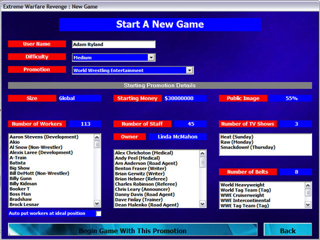 You must manage many aspects such as feuds, angles, TV events, finance, relationships and more. The game can be easily updated with new wrestlers and federations with the built-in database editor. If you want a large update there are many users made databases available on the net.