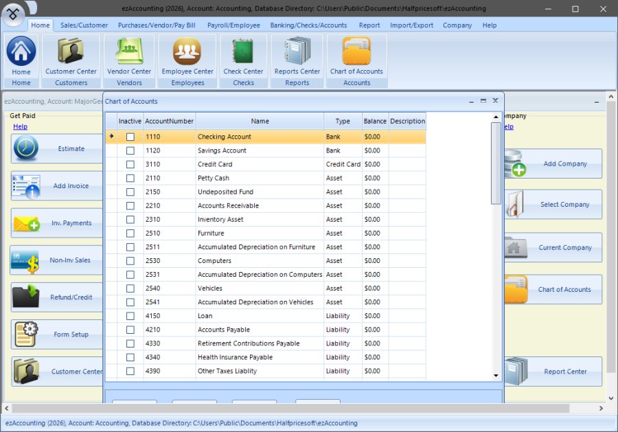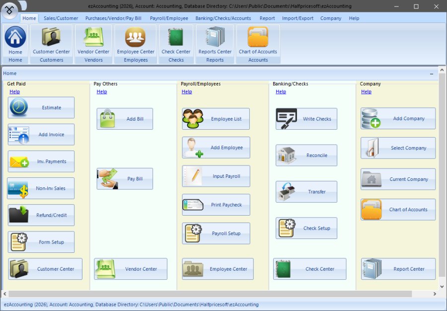 ezAccounting from Halfpricesoft is Windows accounting and payroll software for small businesses that don’t want another monthly bill just to handle their bills. It has a nice button-style interface covering income, expenses, invoicing, payroll, check printing, and tax forms. It took a bit to get used to how things are laid out here, but after some time, it began to make a lot of sense.