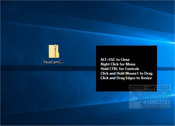Using FaceCam Cover is simple. A small black window will appear that you can drag anywhere you like. If you line your mouse over the window, you will see all of your keyboard shortcuts. The shortcuts include Close, Menu, Controls, Drag, and Resize.