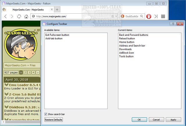 Falkon Browser has all standard functions you have come to expect from a web browser. It includes bookmarks, history (both also in sidebar) and tabs. Above that, it has by default enabled blocking ads with a built-in AdBlock plugin. But make sure you disable the AdBlocker for MajorGeeks - we have to eat and all.