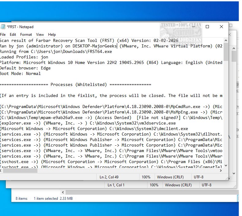 Farbar Recovery Scan Tool quickly scans and then displays detailed information about the Windows Registry loading points, services, driver services, Netsvcs entries, known DLLs, drives, and partition specifications. It will also list some important system files that could be patched by malware. The report provided is automatically saved as FRST.txt in the same directory as the original download for easy access. It contains a lot of information but is presented in a relatively easy-to-read format.