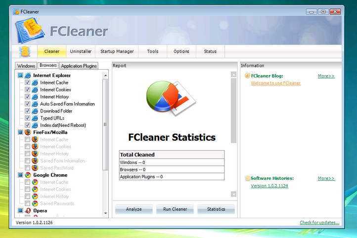 FCleaner is a freeware all-in-one Windows cleaning and optimization tool. It removes unused files that are eating up your disk space and slowing your system down, tweaks your system and allows your Windows to run faster. FCleaner can also protect your privacy such as Internet History, the Cookies that websites leave behind. You can erase all the traces of your online activities in just one click with the help of FCleaner. NO Experience Or Computer Skills Necessary! FCleaner is free, but it does not contain any Spyware or Adware.