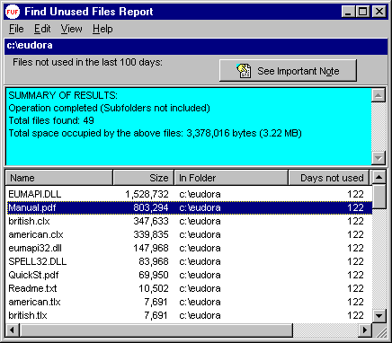 Have you ever wondered how many files are unused on your disk for the last 300 days? Find Unused Files can show you a report of such files. You can tell Find Unused Files to look for files which have not been used for a certain number of days. You can specify which folder to look in and whether to include the subfolders when looking for such files. Try Find Unused Files, and you might be surprised by the results.