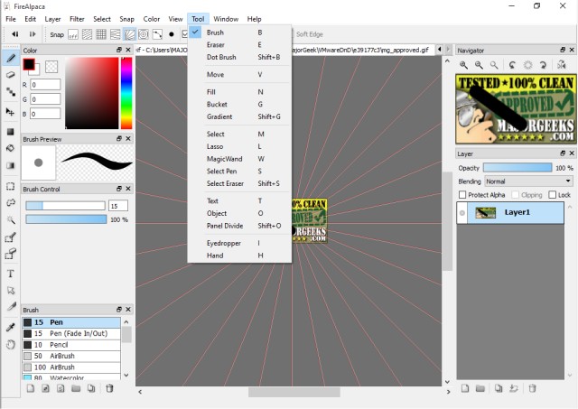 FireAlpaca is incredibly simple; there is no need for any tricky controls at all, making it highly recommended for beginners. And, of course, there is enough for the advanced users as well. Pen, Pencil, AirBrush, and Watercolor are ready to use via the default setting, but you can customize your pen too. A crisp stroke with the pen and the soft-edged watercolor effect is the most popular brush type.