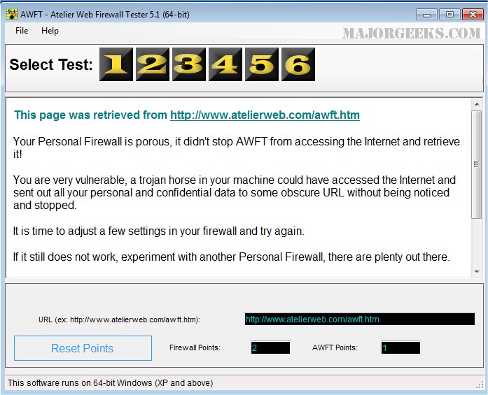 Atelier Web Firewall Tester (AWFT) tests your personal firewall by using several different techniques in an attempt to punch through and gain access.