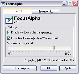 FocusAlpha is a small utility program that will trigger Alpha Transparency for all the windows on your desktop. When u select a window (set it on focus) it removes the transparency for that window and sets all the others transparent. The program allows you to control the level of transparency and you can also specify certain program names that you don't want to be transparent in the exclusion list.