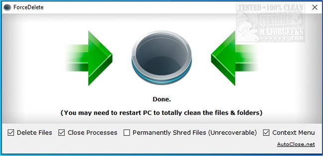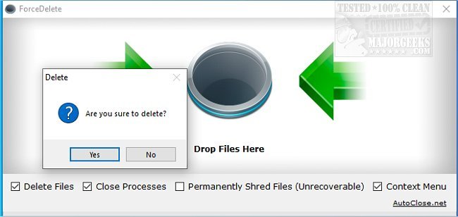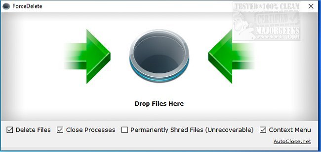 ForceDelete also has a "Shred Files" option for users to delete files/folders from the hard drive permanently. Additionally, ForceDelete supports batch command line mode allowing you to run forcedelete.exe from the command line and batch delete files/folders.