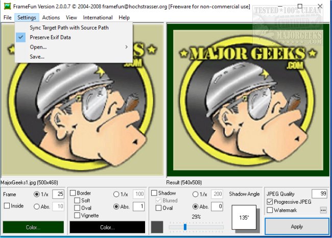 FrameFun is a simple application with a straightforward UI that allows you to select an outer frame, a border around the image, and a drop shadow for a 3D effect. It lets you modify the color and width of each Frame, Border, and Shadow. Additionally, you can modify the direction of the drop shadow. You can also add watermarks to the images.