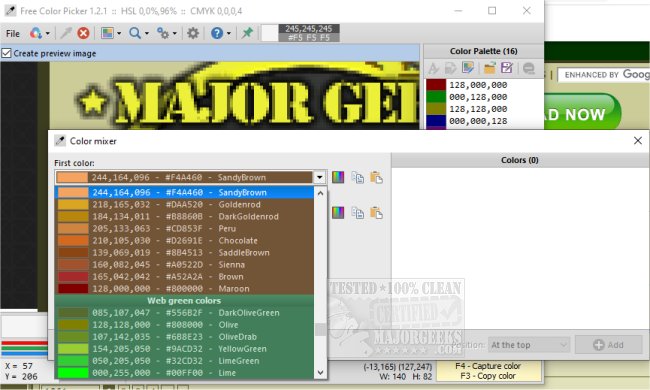 This portable app is chock-full of options and features that let you hone in on colors. To capture a specific color, you can move your cursor to the target and hit the F4 key. The color that the cursor is pointing to will be added to the color palette located at the right-hand side of the UI. You can also utilize color capturing, which permits you to magnify the area for the current cursor position (mas magnification is 30x).