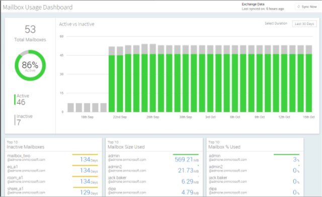Mailbox Usage Reports: Monitor mailbox size trend, mailbox over quota, active and inactive mailboxes.
