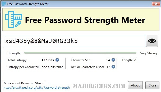 Free Password Strength Meter is very easy to use - you just need to enter your chosen password, and the application will show the strength level by using information entropy as a measure of strength and reliability.