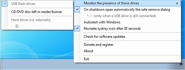 Note about external HDD: Free USB Guard can detect them only if they are plugged after the software has been started. Otherwise, you can select them manually in the menu "monitor the presence of these drives".