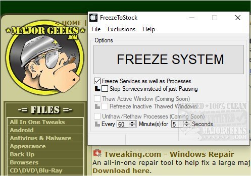 Using FreezeToStock is simple; there is a big button labeled Freeze System. Below that button, you have the option to Freeze Services and processes with a sub-action of Stopping Services instead of pausing. Keep in mind, if you stopped services instead of pausing them, you will be required to restart them after your game session manually - so this feature should be left to more experienced users.