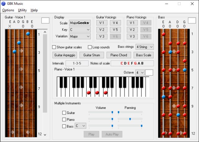 Option to hear 2 or 3 instruments together with the option to change volume and panning - an option also to change bass note in 'Multiple Instruments' plus Auto-Play added in the same section.