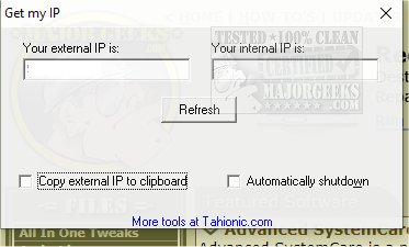 Get my IP includes several configuration options that allow you to set it to start, retrieve your IP, place it on the clipboard and automatically shutdown itself. When you have Copy External IP and Automatically Shutdown options active, Get my IP will automatically place your external IP address to the clipboard and then shutdown itself. All you have to do is to paste your IP from the clipboard to where needed.