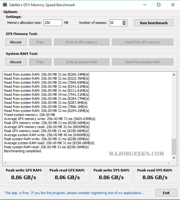 The program is simple to use, with all options on a single screen. You can choose the number of passes from memory allocation and apply each of these settings to the GFX and or system RAM. From there, you can free the memory back or read and write to GFX and system memory. The included tests run very fast so as not to take up much of your time. GFX Memory Speed Benchmark is a decent way to test your memory speed and compare it to others or even isolate bad memory sectors if you encounter speed issues. Diagnosing memory issues on a graphics card is generally challenging to perform, so this could come in handy in that type of situation.