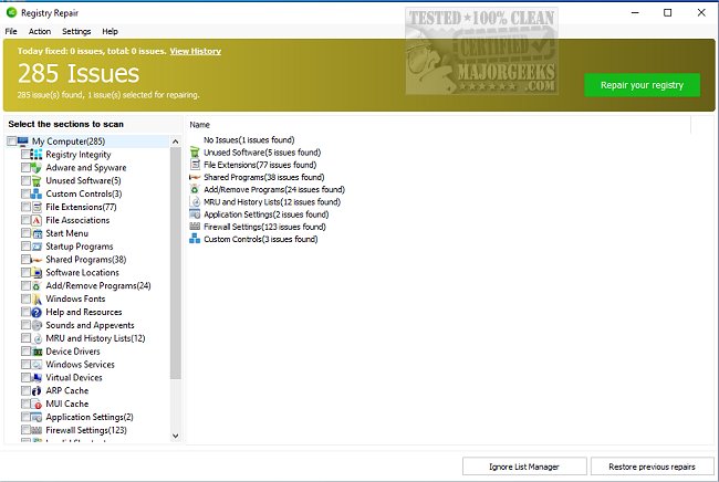 Whenever you clean the Registry, a corresponding Undo file is generated for any changes made, recreating the deleted entries. You can restore any changes by clicking 'Restore previous repairs.' Registry Cleaner uses an 'ignore list' which contains entries that are ignored when encountered while scanning for added security.