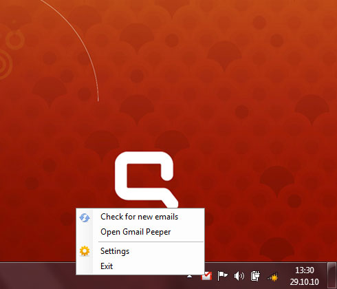 Gmail Peeper is a free Gmail notifier program which provides an attractive and simple way to check for new mail messages without opening your browser. It is using Gmail secured RSS feed to retrieve the new mails and is written in C#.