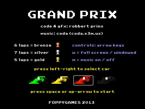 In Grand Prix, the ultimate goal is to try and complete 8 laps, winning the gold cup. This is quite a challenge, with the clock ticking down and opponent cars getting in the way. The car is controlled using the arrow keys. The music in this game is by coda (http://coda.s3m.us). Source code (Blitz Max) is included.
