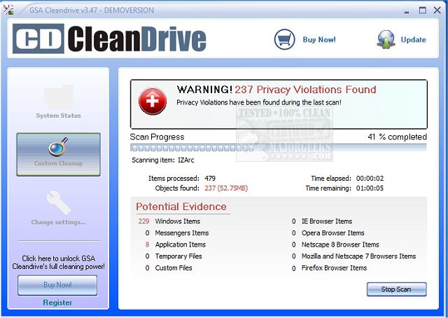 GSA Cleandrive makes deleting the history of activities off of your PC easy through a very friendly UI that provides details so you can make an informed decision of what to get rid of. Some of these leftover tracks could be used to steal your identity or exploit your machine.