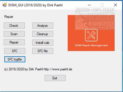 It provides you with the ability to check whether there is component memory corruption through a GUI that some users may feel more comfortable utilizing. The Interface is straightforward and offers Check, Analyze, Scan, Cleanup, Repair, Install cab, SFC, SFC File, and SFC logfile as its options. Clicking on one directs the command to be run for you.