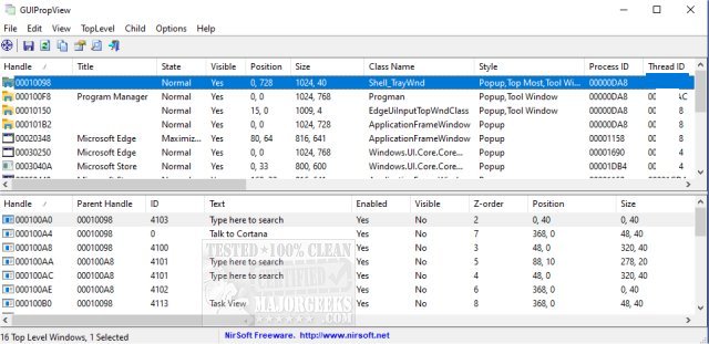 You are given two separate panes to utilize; the top is a list of all top-level windows. The bottom pane lists all child windows associated with their 'parent' or the selected top-level window. GUIPropView is a modern replacement for Nirsoft's WinLister app.