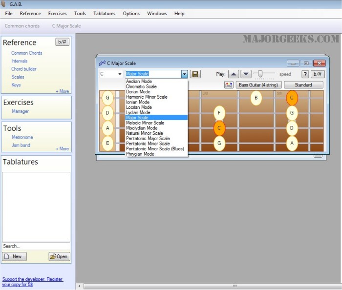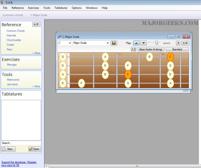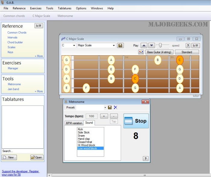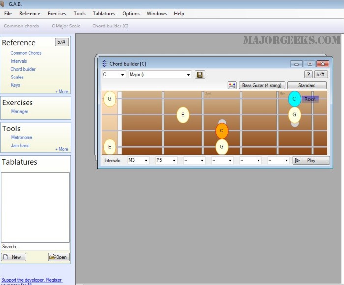 If you are a musician, you will probably be interested in the ear training exercises. Guitar and Bass (G.A.B.) includes multiple ear training exercises to get you used to the proper way of hearing and identifying chords.
