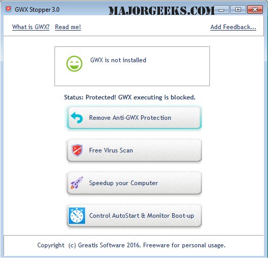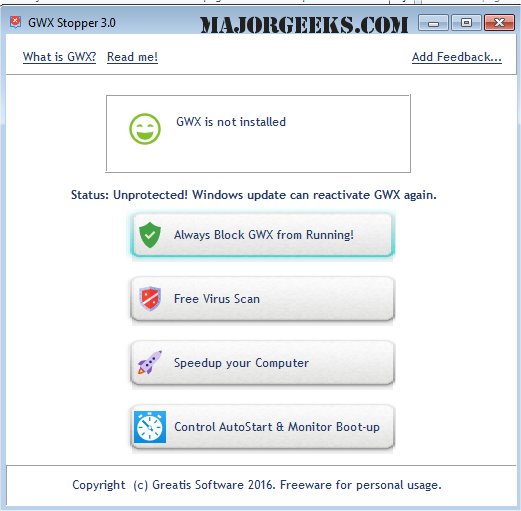This purpose driven program uses GWX's own configuration settings to tell it to stop bothering you and from stealing PC resources which ultimately can make your machine run slowly.