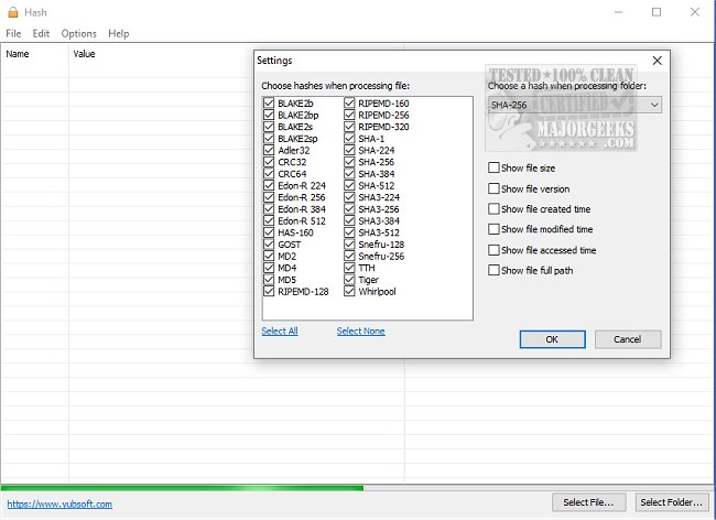 Hash is a standalone app that calculates and displays the hash for your selected file or folder. Hash is displayed in a simple and highly organized UI with minimal settings. You can choose the hash type you want Hash to calculate. You also have the option to show the file size, file version creation/modified times, when last accessed, and the full file path. Additionally, you have the option to keep Hash always on top, append the output result, and use lowercase for results.