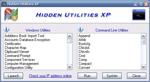 Hidden Utilities provides easy access to over 200 utilities that are not easily accessible to the user. System information, diagnostics, repair tools and more in both Windows and Command Line utilities are now easily opened as well as many often used applications. Hidden Utilities includes easy access to 200 Windows tools and Command Line utilities. Hidden Utilities is compatible with Windows XP/Vista and Windows 7.