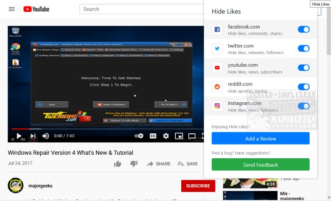 Operation is simple once installed, hit the Hide Likes icon, from there you can select via toggle switch which supported site will show/hide likes.