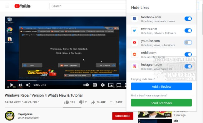 Hide Likes currently supports Twitter, YouTube, Reddit, and Instagram. Some people are driven by obtaining a 'Like" for a post they have made; while it is intended to be fun, some measure their worth on the amount they receive. You can free yourself from these social constraints with Hide Likes.