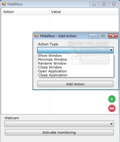 This is a straight-to-the-point utility; you select the desired action type from the drop down window like hiding a window or closing an application if your webcam detects any type of movement. The sensitivity of detection can not be adjusted through the program but if you have a decent webcam that should suffice.