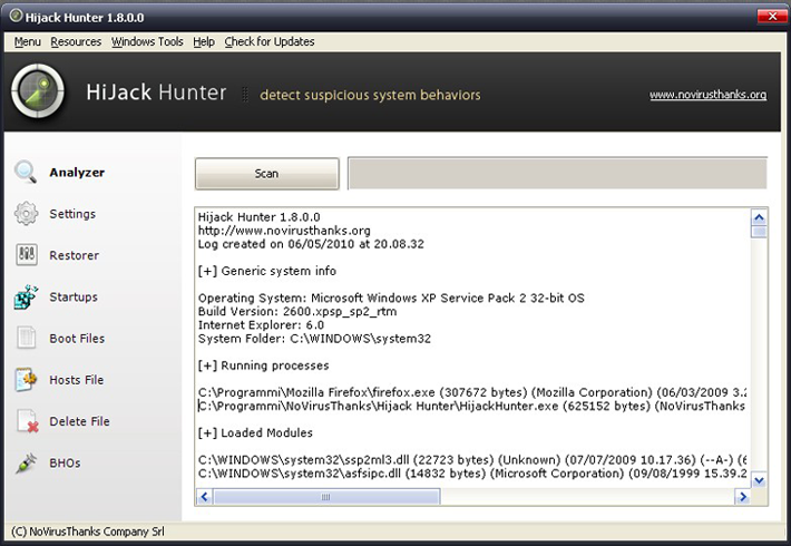 Hijack Hunter is an application that thoroughly scans your computer and displays all the gathered data in a comprehensive way. To help the users to detect suspicious system behaviors, our product shows all the needed information in a report file, taking care of all details, on running processes, registry startups keys, drivers installed, windows hijacks, browser helper objects and much more.
