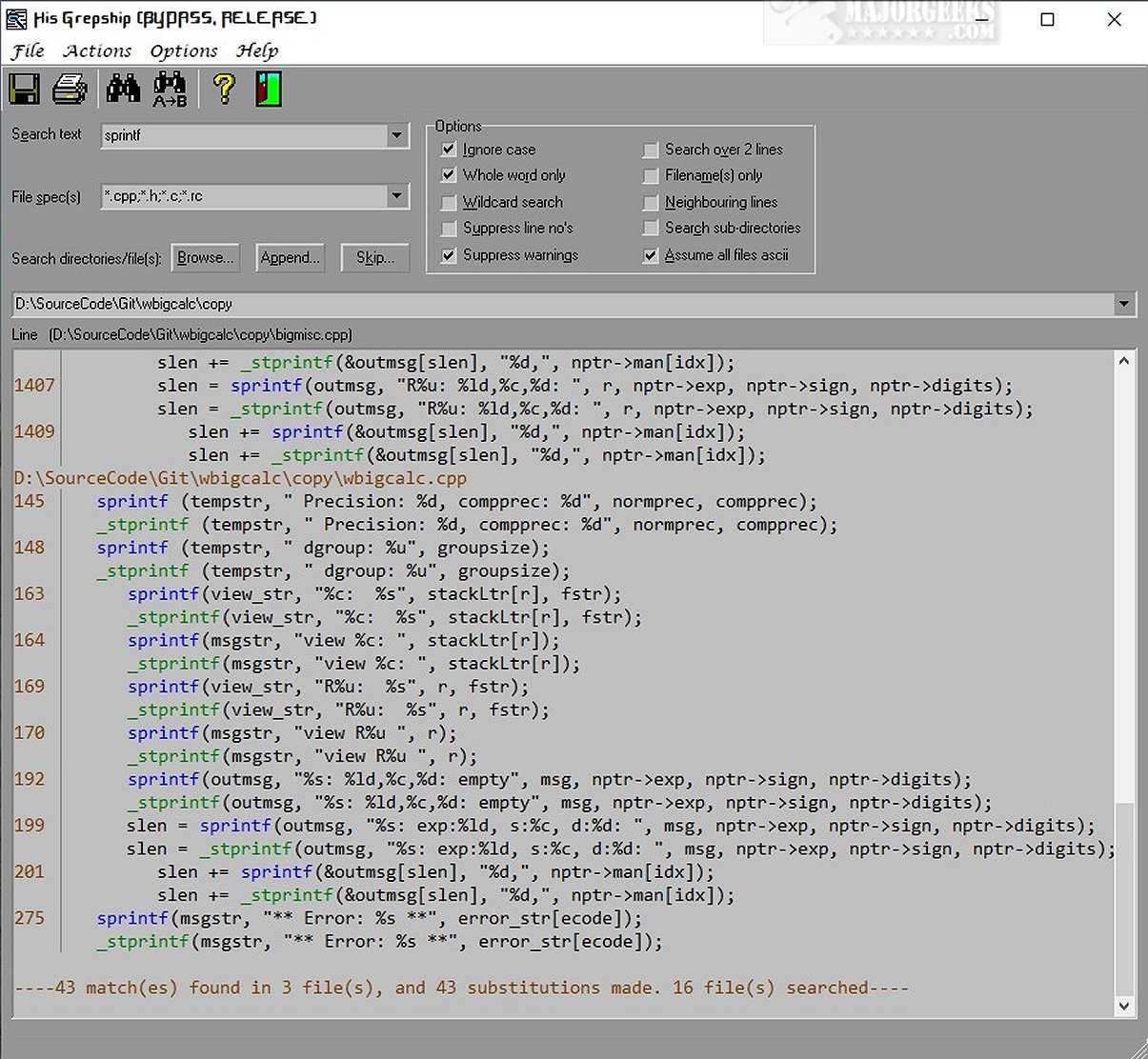 Another very nice feature of this program, which many otherwise excellent grep-style programs lack, is the display of the before-and-after results of a search-and-replace operation. This is a very desirable option, especially when doing regular-expression replacements; it is just so easy to get the operation wrong! Yet most of these programs do not consider this very important, which is why the developer continues to keep this available on his machine(s) and why he is making this effort to ensure the program remains available to all.